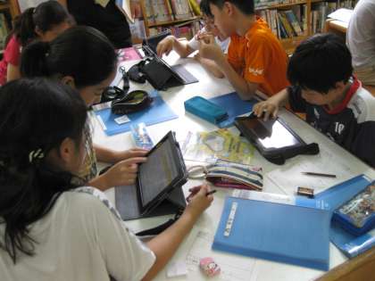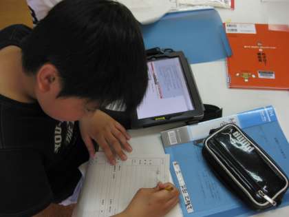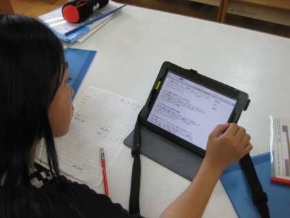 「図書館では、静かに本を読む」というのは前のこと・・・当然このことも大切ですが、たくさんの本やパンフレット・パスファインダーで、自分の学習課題や学習問題を解決する場所です。特に、タブレット型PCが図書館に置かれてからは、自分のノートのすぐ横に置いて調べ学習ができるので、『図書館って便利なところ』という感覚の子どもたちが多いようです。(図書館でコピーもできます)