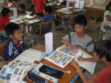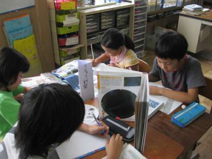 テーマ別に集まって新聞づくりをしています。図書館から本を借りてきて自分なりにまとめて新聞づくりをしていました。