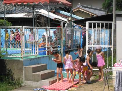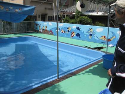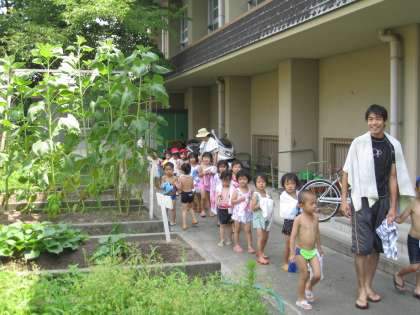 上賀茂幼稚園のプールは、上賀茂小学校学校園の北側にあります。今年は、リニューアルオープンしました。園児達が気持ちよさそうにプールから帰ってきました。
