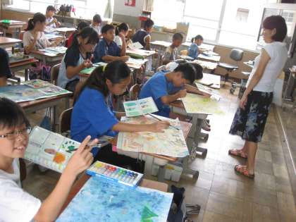 6年生のこのクラスでは、熱心にお話の絵に取り組んでいました。まず、バックを工夫して幻想的な雰囲気を出していました。