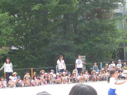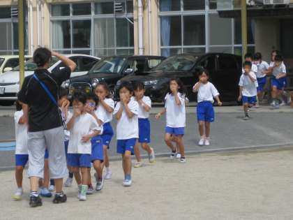 上賀茂校区にある、幼稚園・保育園・小学校による、合同の防災訓練がありました。今回は、火事を想定して小学校と幼稚園は避難しました。運動場に避難した後、上賀茂保育園の子どもたちも一緒に、北消防署による放水訓練の様子を見せていただきました。きびきびとした動きを、子どもたちは真剣に見入っていました。