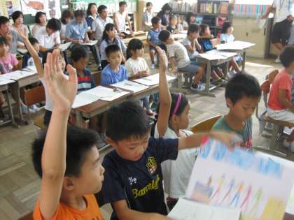 1つの教室でたくさんの人数が一度にすると隣の人の声もひろってしまうので、隣の教室も借りて授業をしました。担任と司書教諭の2人で指導しました。