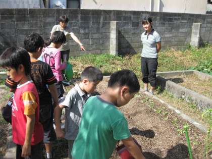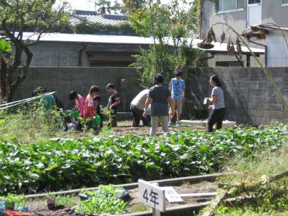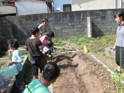 花壇で楽しそうに種植をしているクラスがありました。4組です。レタスを先日植えて、今日は大根の種まきをしました。早く立派に大きく育てばいいですね。そのためには、お世話を忘れずに!