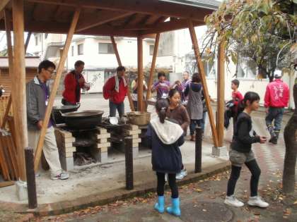 学校でダブルダッチ(なわとび)を教えていただいたり,飯盒炊さんをしたりしました。炊いたご飯で,おにぎりにして,トン汁と一緒に食べました。