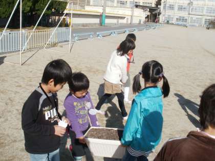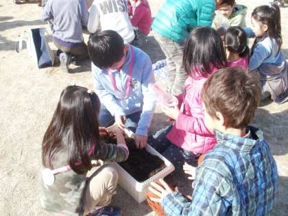 いよいよ球根を植えます。1年生の時に植え方を学んだ2年生。今度は、教えてあげる立場です。いい顔して、園児達に優しく教えてあげることができました。