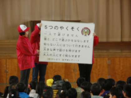 体育館に集まった後,北警察署や平安レディースの方から,自分の身を守るためにすることについてのお話を聞きました。危ない場面では「大声を出す」や「走って逃げる」,新しいゲームがあるからついておいでなどの「誘いにのらない」などのお話でした。子どもたちは,しっかりと質問にも答えていました。正しい判断で,自分の身は自分で守れるようにしていきましょう。