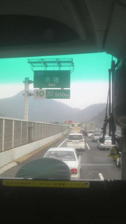 瀬戸大橋を渡り 3時15分現在 赤穂市付近を走行中。渋滞があり,予定より学校着が遅くなるかもしれません。連絡があり次第 随時お知らせします。