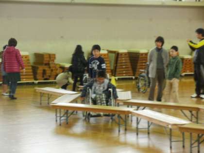 社会福祉協議会の方々にご協力をいただき,段差や細い通路などを車椅子で通る体験をしました。普段は何でもない段差が,車椅子を使ってみると大変なことに気づきました