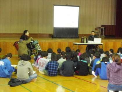 また,車椅子を使っておられる方に来ていただき,体が動かなくなった時の気持ちや日常の生活の様子などのお話を聞きました。体が不自由になって初めて気づいたこともたくさんあったそうです。