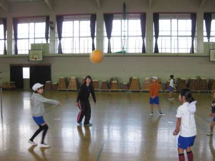体育館では、4年生がソフトバレーボールをしていました。今日が初めてのようで、なかなか難しそうでした。話し合いながら、自分たちが一番楽しく動けるルールを考えるものいいですね。
