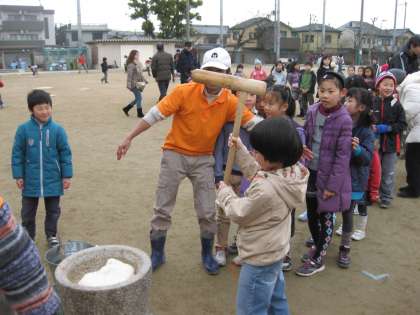 いよいよ、お餅つきです。杵の重さに負けないように力を振り絞ってお餅をつきました。