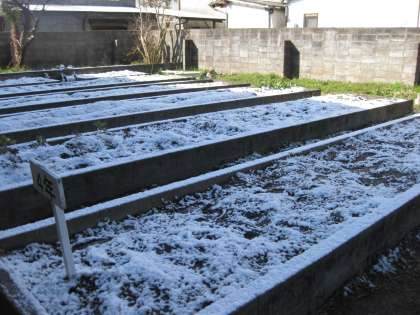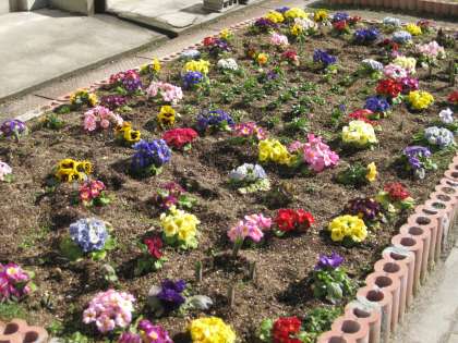 3月も中旬にさしかかろうとしていますが、昨日は突然の雪と寒波でした。しかし、中庭の花壇やみのりの像あたりでは、しっかりと春の準備ができています。