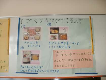 昨日の給食は給食室で1枚1枚手作りをしたトンカツでした。