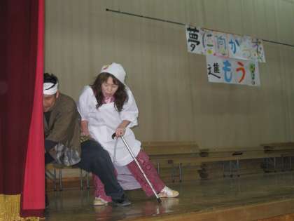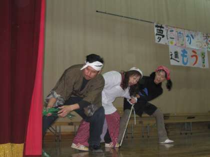 突然、職員劇が始まりました。英語の台詞です!!!