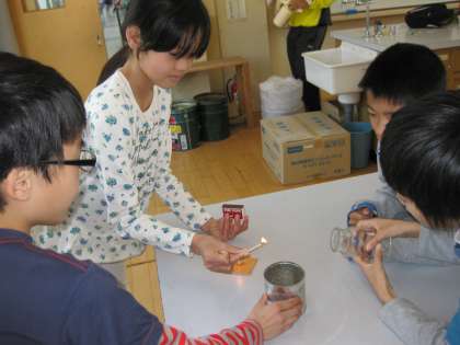 6年生の理科には,昨年度に引き続きスクールサポーターの田端先生においでいただいています。今日は,燃焼の実験のようです。マッチで火をつけていましたが,結構上手にすれていました。