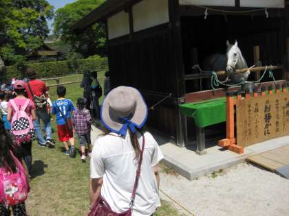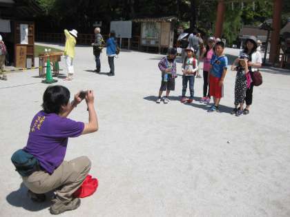 正門出発のグループは,まず,上賀茂神社に向かいます。二の鳥居の前で記念写真を撮って,問題を解きます。