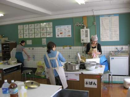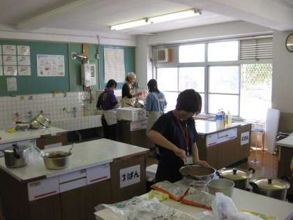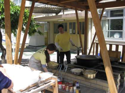 子どもたちが,カードラリーをしている間に,学校では,おやじの会の方々とPTAの方々が,中庭のかまどと家庭科室に分かれて,カレー作りです。