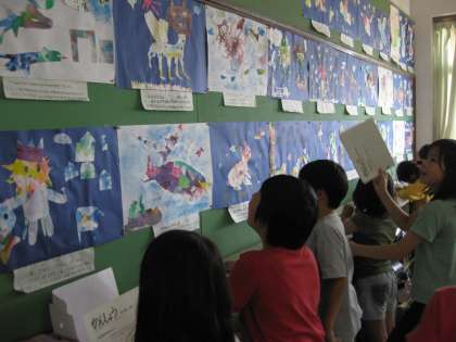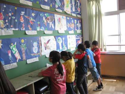 絵を描くだけではなく,人の絵をみることによって,友達が工夫をしているところを発見したり,自分とは異なる表現の仕方を発見したり,自分と同じようなところ発見したりすることができます。このことは,次の作品を描くときの意欲につながると思います。次の作品をまた頑張ってくださいね。