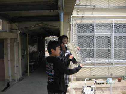 今日は,1年生と3年生が校外学習です。1年生は植物園に,3年生は大文字山に行きました。3年生が大文字山の頂上付近に着いたときに,学校から大きな鏡で太陽の光を反射させて学校の位置を知らせています。ちゃんと見えたかな?
