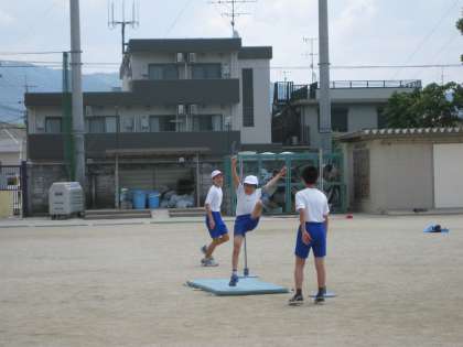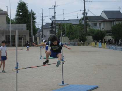運動場では,6年生が走り高跳びにチャレンジしていました。はさみ跳びは,抜き足が難しいですね。何回も練習をしてください。
