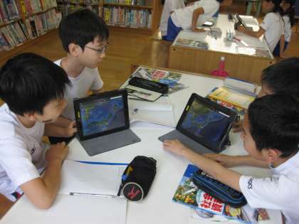 画像は,5年生がグーグルアースを使用して,日本の国土の特徴を調べています。拡大したところをすぐに拡大できるので便利です。