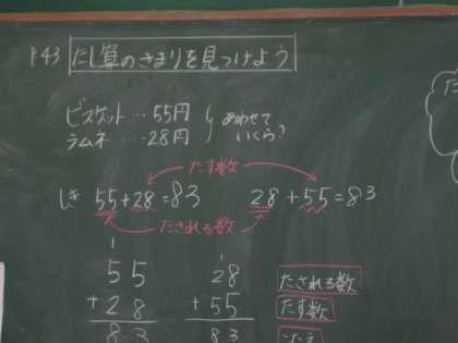 2年生の教室では,たし算のきまりについて勉強をしていました。しっかりノートをとってよく考えています。とても綺麗に整理されたノートを見つけました。