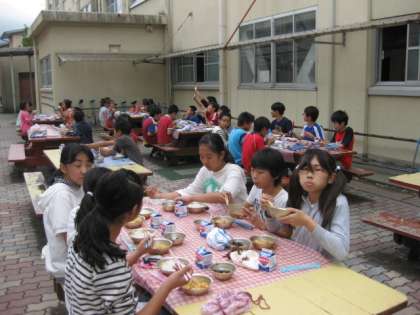 今日は,日中雨もやみ,比較的過ごしやすい日となりました。そんな中,中庭のウッドテーブルで6年2組が給食をいただいていました。きっと,普段と違う雰囲気なので食欲も進んだことと思います。