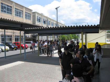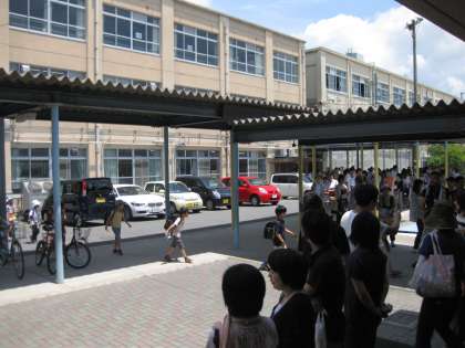 *今日は,一斉に引き取りが始まりましたので長い列ができましたがわりと短時間ですみました。しかし,本番の時は,引き取りにこられる時間がまちまちなので,もっと長時間になります。20〜30人程度になったら,体育館から図書館に移動することも考えています。