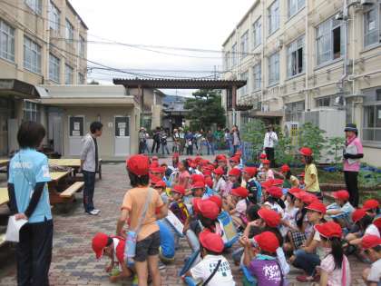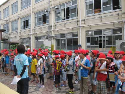 3年生が教室から降りてきました。担任の先生から諸注意を聞いて,いざ出発です。