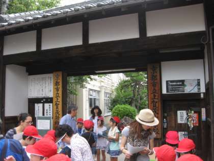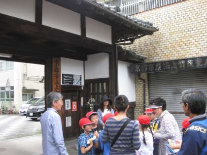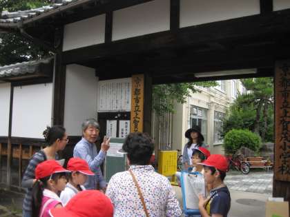 学校の正門のポイントです。「350年前に社家の集会所が・・・」と地域の方に説明されます。子どもたちは,熱心に耳を傾けていました。