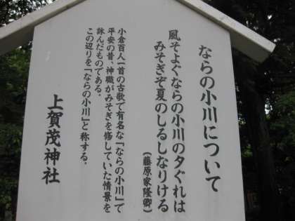 上賀茂神社の中を流れる「ならの小川」です。ここもお話を聞くとなるほど!と思います。そして,この「ならの小川」のことを和歌にした有名な歌人がいます。小倉百人一首の中にもありますよ。