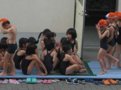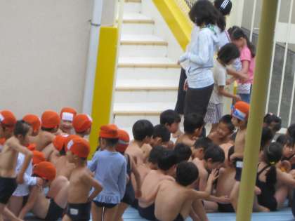 曇り空で気温もそれほど高くはないのですが,1年生の子どもたちはプールでの水遊びを楽しみに待っています。早く入りたいようです。