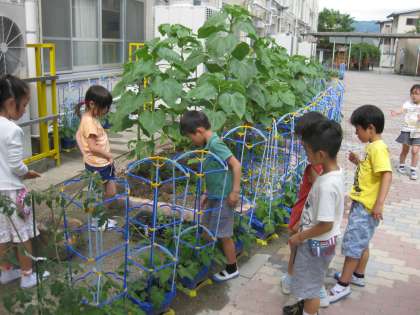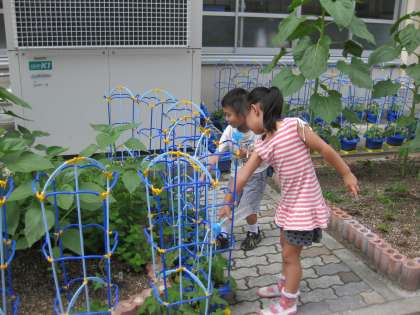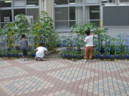 1年生が育てているアサガオがどんどん育っています。つるも伸びてきたので,支柱を立てました。2日間お休みになるので,たっぷり水をやりました。