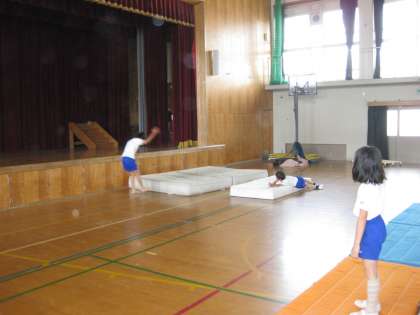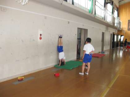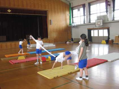 体育館では,5年生が器械運動に取り組んでいました。学習の場をいろいろと工夫して様々なワザに取り組んでいました。ちょっとした工夫で,運動の支援となるのですね。