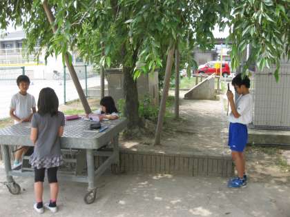 5年生が運動場の木陰でタブレットの録画機能を使って国語の学習をしていました。教室でもグループに分かれて,インタビューをしている様子を録画しています。台数があって手軽に録画できて,すぐにみられるのでとっても便利ですね。自分のインタービューの様子を振り返って,もう一度挑戦している子もいました。