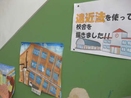 北校舎の階段に6年生の作品が掲示してありました。4月から苦労して書き上げた校舎の絵です。遠近法を使ってうまく距離感と立体感を出せています。よく頑張りました!