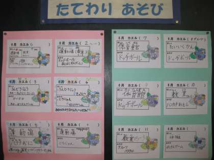 今日は,たてわり遊びの日です。たてわりお知らせ掲示板にそれぞれのグループが今日のロング昼休みにあそぶメニューが書かれています。朝から何人もの子どもたちが,集合場所と遊びの内容を見に来ています。