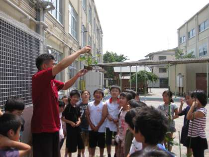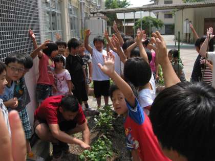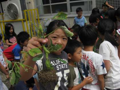 2年生が中庭で育てている野菜が少しずつ実ってきているようです。毎日,一生懸命に水やりをしているからだね。