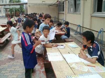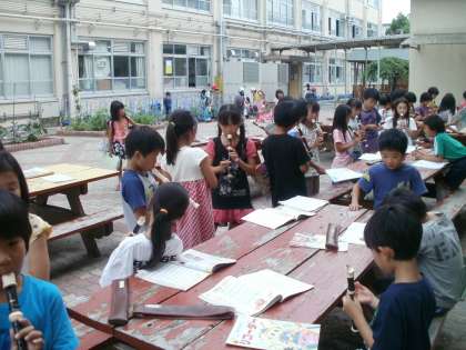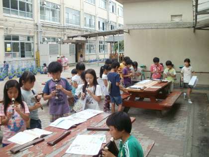 中庭からリコーダーの音色が聞こえてきました。3年生が,自主的にリコーダのテストを受けていました。合格するとどんどん難しい曲に挑戦できるそうです。4月から始めたばかりですが,みんなやる気満々です。長い長い列ができていました。