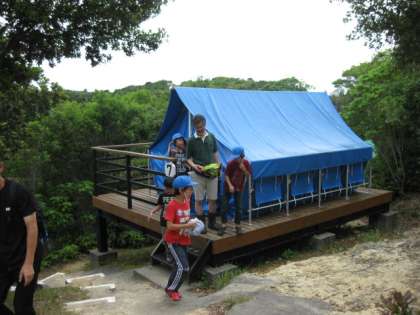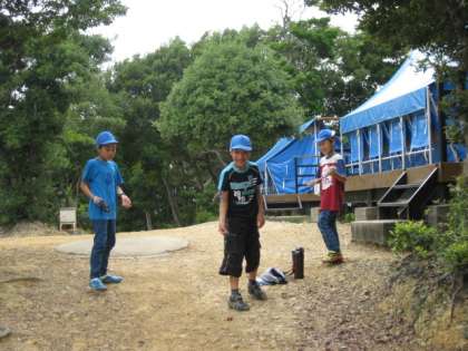 今日は、夜に雨が降る予報ですので、テントでは寝ることができません。そこで、テントサイトにいって雰囲気だけ味わいました。今の時刻は午後7時、雨は降っていません。みんな元気です。