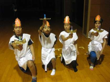キャンプファイアの本番前のリハーサルです。火の子の役割は責任重大です。ちょっと緊張気味かな。