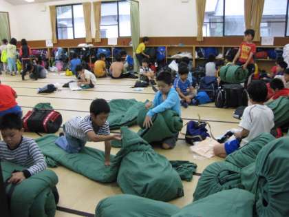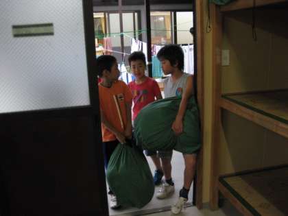 おはようごいます。みんな、ぐっすと寝ることができたようです。自分の使った寝袋は、しっかりと後片付けします。一人では、なかなか大変なので自然と協力しあっていました。