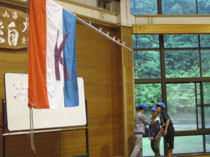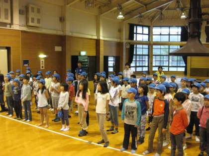 朝の集いです。司会の役割、旗揚げの役割、しっかりとできました。そして、校歌も元気よくうたえることができました。一日の始まりにふさわしい朝の集いでした。