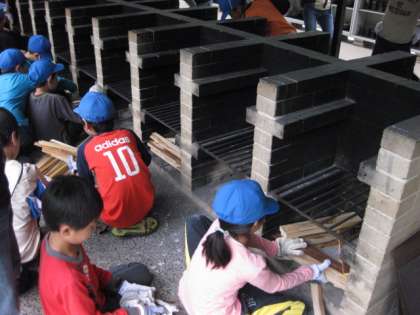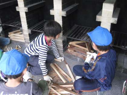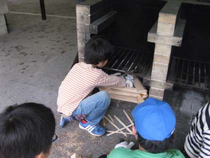 かまど係は、新聞紙1枚で火をつけるために、工夫して薪組をしました。