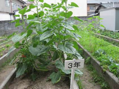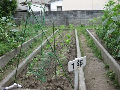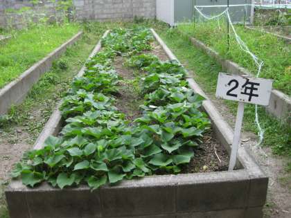 中庭だけではなく,体育館の西側にある畑でもそれぞれの学年が,花や作物を育てています。以前は,ほったらかしの畑でしたがPTAより,園芸倉庫を寄付していただき道具などが使いやすくなったので,自然と使われるようになりました。ありがたいことです。