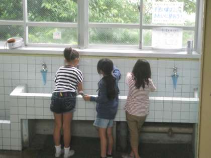 2階の洗面所もぞうきんをゆすぐ子ども達でいっぱいです。