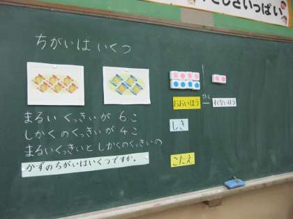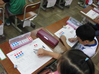 1年生では今,ひき算を勉強しています。いきなり頭の中でするのは難しいので,ゆっくりとブロックを使って問題を解いています。頑張ってくださいね。