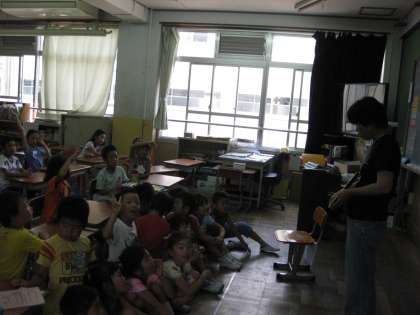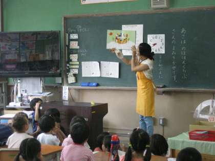 1年生の教室では,前の方に集まって絵本をじっと見つめている子ども達もたくさんいました。PTAのほほんクラブの皆さんの読み声に興味深そうに耳を傾けていました。