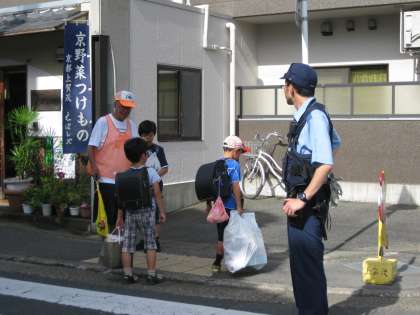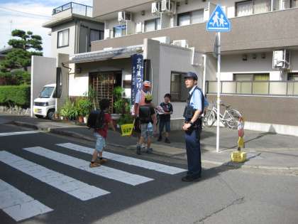 今日も,上賀茂派出所の警察官の方が,登校指導にご協力いただきました。警察官の方が横断歩道の横に立っていただくだけで,車やバイクのスピードが今までと違うように思えます。ありがとうございました。