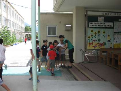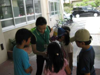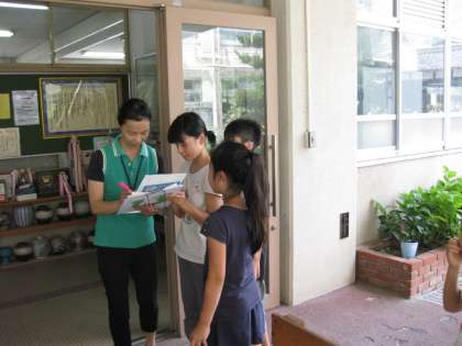 職員室前のテーブル付近に人盛りできていました。どうやら岡西先生が子ども達に取り囲まれています。動くポイント『岡西先生をさがせ!』です。岡西先生を見つけたらサインをもらえます。ウオーリーを探せ!みたいですね。ちょっと古いかな?